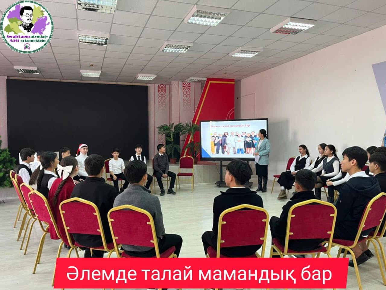 Мектебімізде "Әлемде талай мамандық бар" тақырыбында 9 - сынып оқушыларымен мамандық таңдау, олардың негізгі түрлері, классификациялық белгілері, мамандықтар тобы туралы білімдерін, түсініктерін кеңейту, мамандық таңдаудың қыр - сырларын меңгерту, кәсіптік бағдар беру мақсатында жоспарға сәйкес тренинг өткізілді.