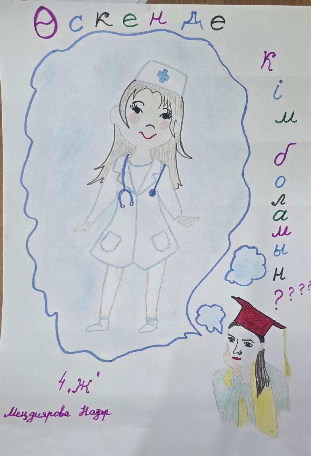 2024 - 2025 оқу жылына арналған Кәсіптік бағдар беру жұмыс жоспарына сәйкес қазан айында 4 сыныптар арасында "Мен кім боламын?" атты сурет салу байқауы болып өтті. Оқушылар өздері өскенде қандай мамандық иесі болатынын сурет салу арқылы бейнелеп, мамандыққа қатысты суреттерін ортаға салды.