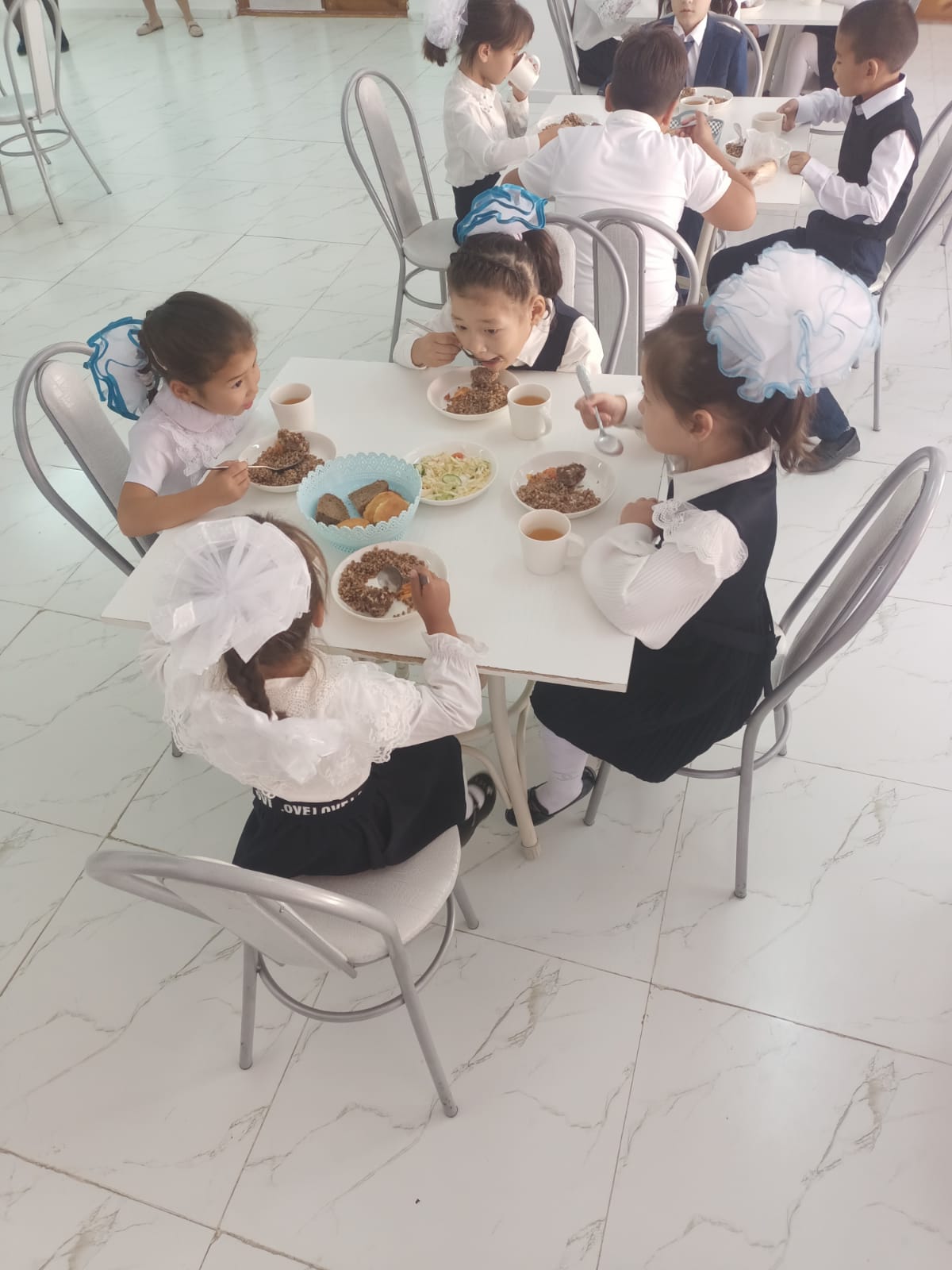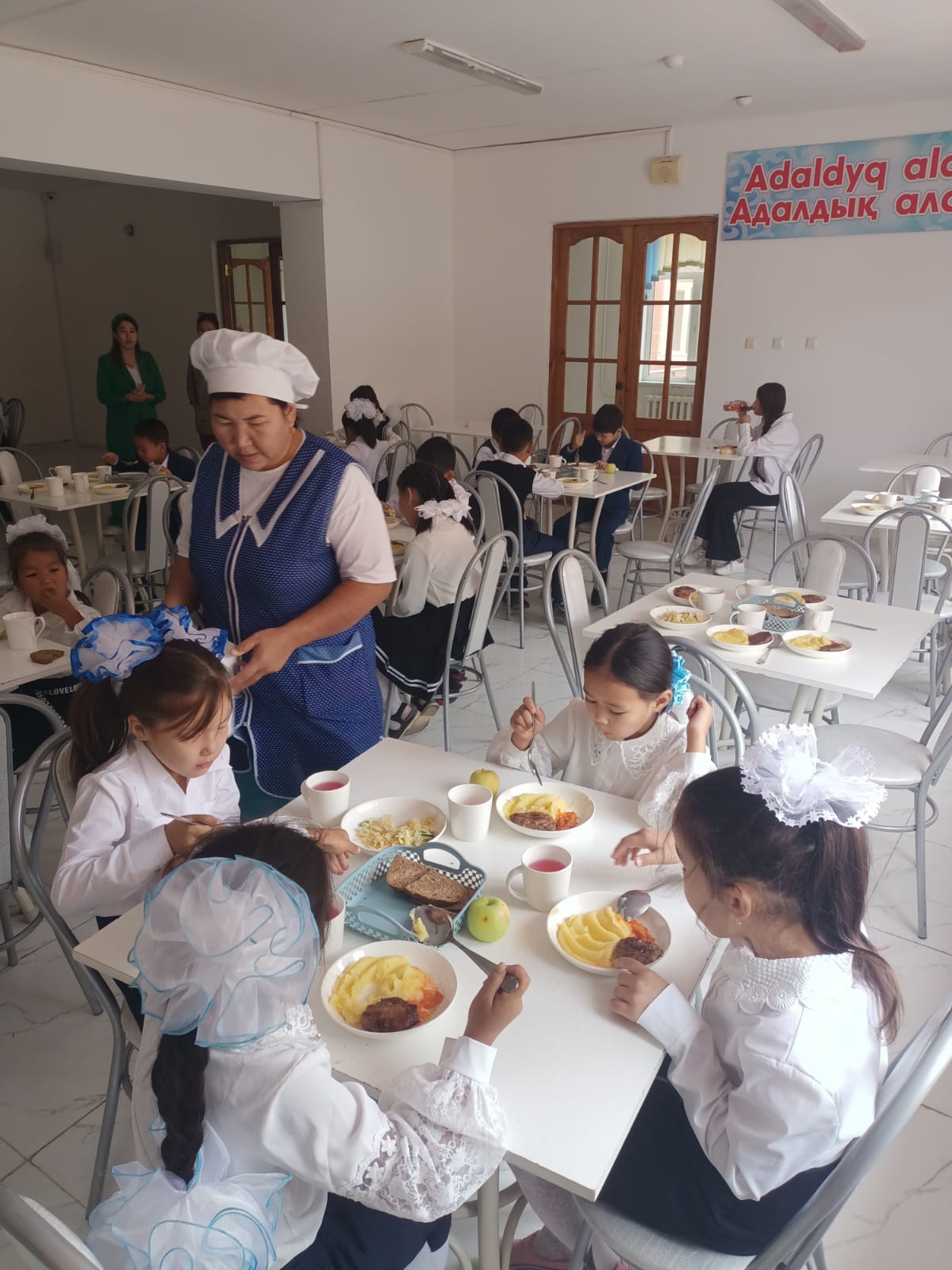 2022 – 2023 оқу жылы бойынша орта білім беру ұйымдарында білім алушыларды тамақтандыруды ұйымдастыру, сондай – ақ мектепке дейінгі ұйымдарда, жетім балалар мен ата- анасының қамқорлығынсыз қалған білім беру ұйымдарында тәрбиеленетін және білім алатын балаларды тамақтандыруды қамтамассыз етумен байланысты тауарларды сатып алу қағидасына балаларды тамақтандыру сапасын бақылауды, тамақтандыруды ұйымдастыру кезінде СанЕн нормаларының негізінде мектеп асханасында оқушыларды тамақтандыруды ұйымдастырылуын бақылау, тағам дайындау технологиясын сақтау, азық – түліктің сапалы ассортиментін қолдау жүргізілгендігін бақылау қамтамассыз ету мақсатында тамыз айының 31 не мектепішілік Қазақстан Республикасы білім және ғылым министрлігінің 2018 жылғы 31 қазандағы №598 бұйрығы шығарылды. «Жалпыға бірдей міндетті оқу қоры есебінен» бөлінген қаржы бойынша әлеуметтік қорғалмаған білім алушылар мен күнкөрісі төмен отбасылардан шыққан 605 білім алушыларға мектеп асханасынан тегін ыстық тамақ ұйымдастырылып отыр. Былтырғы оқу жылында 442 оқушы тамақтанса биылғы жылы 163 оқушыға саны артып отыр. Ыстық тамақпен қамтылатын оқушылардың құжаттары 5 санат бойынша қабылданды.